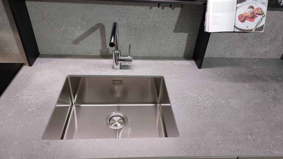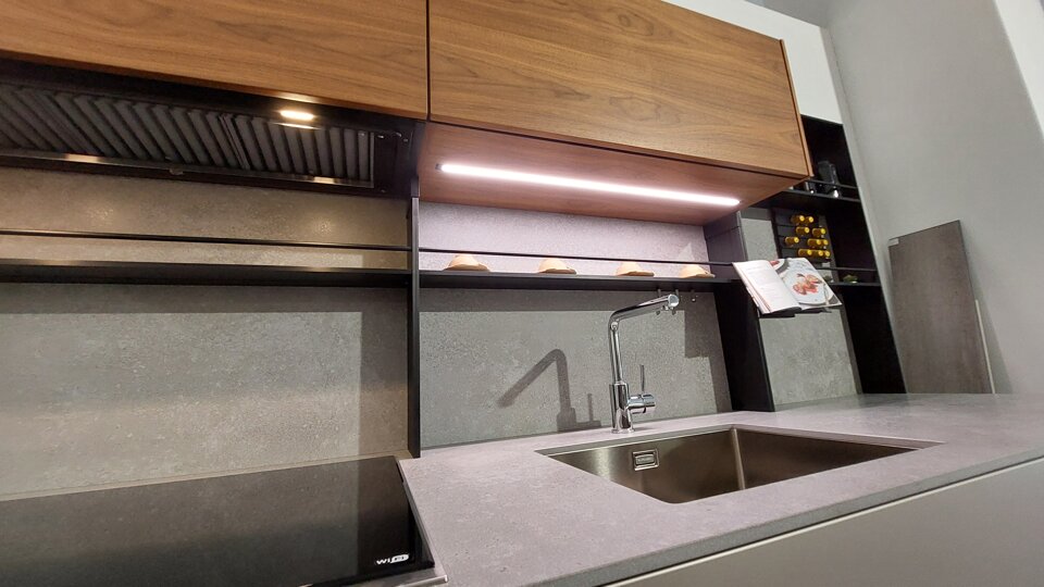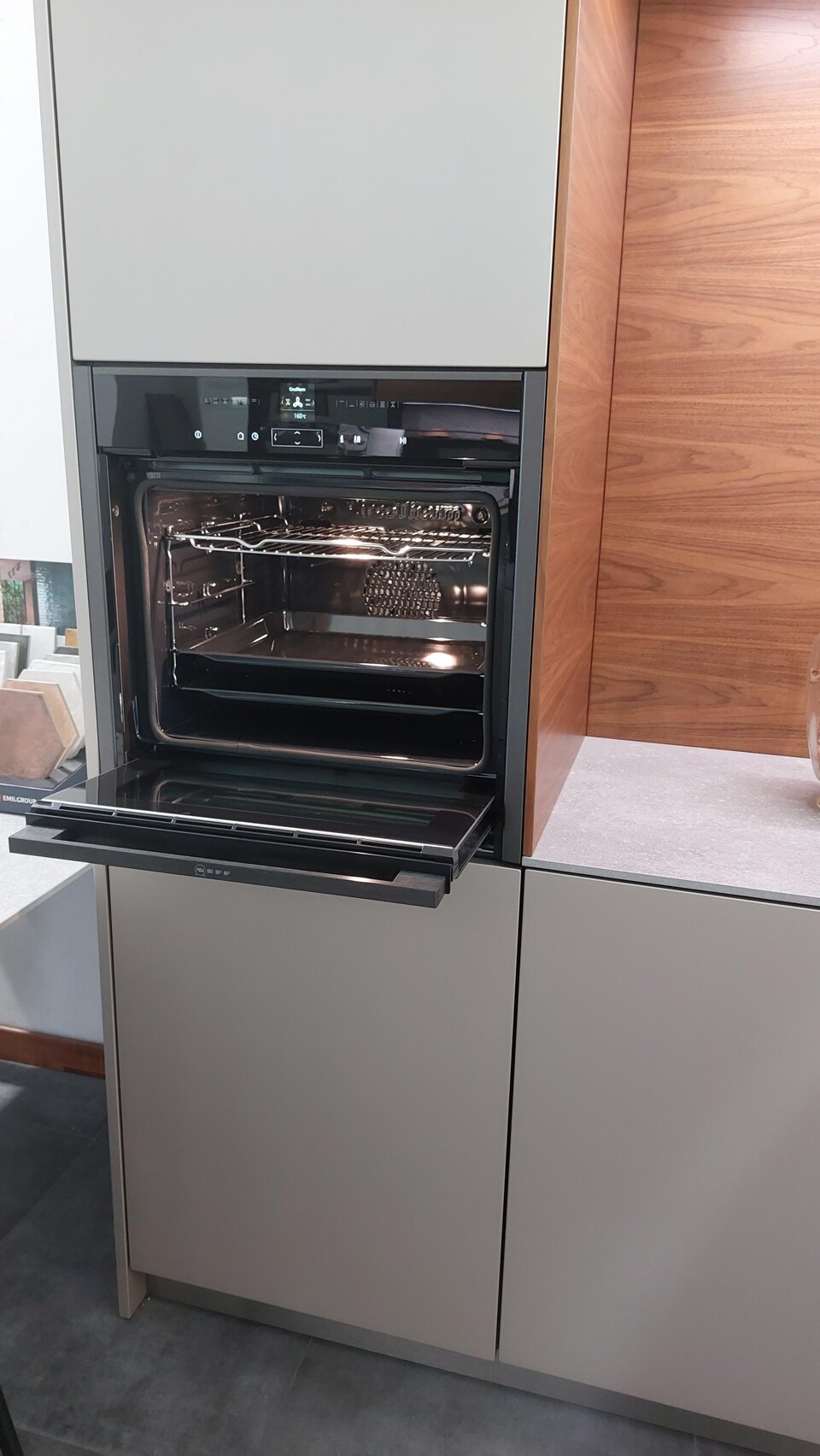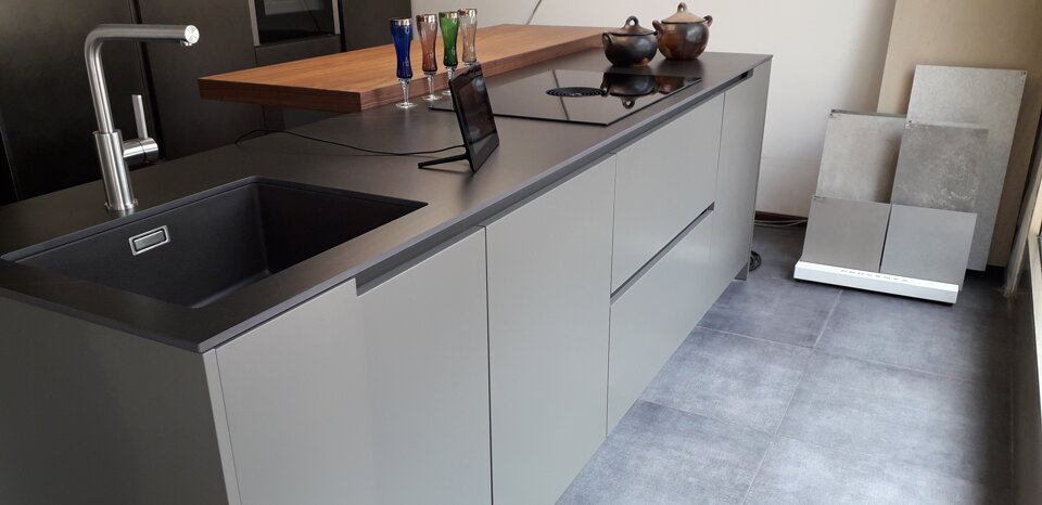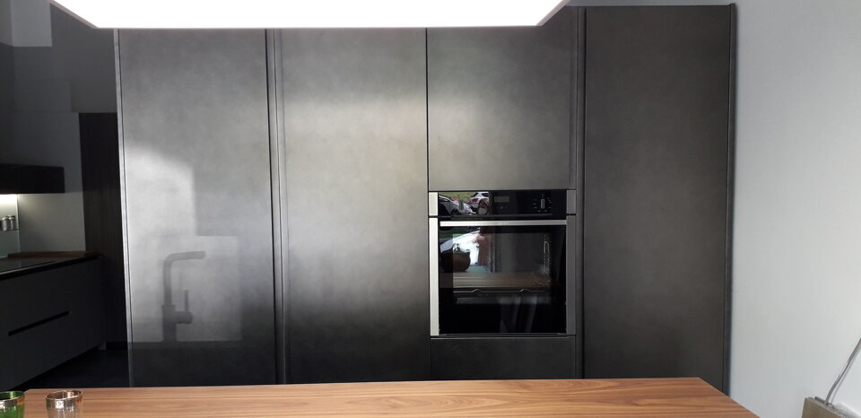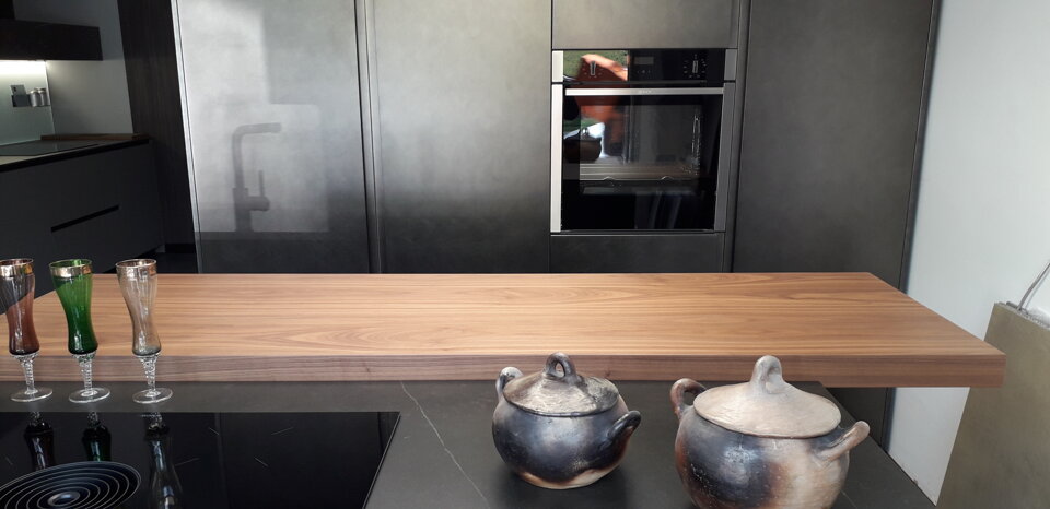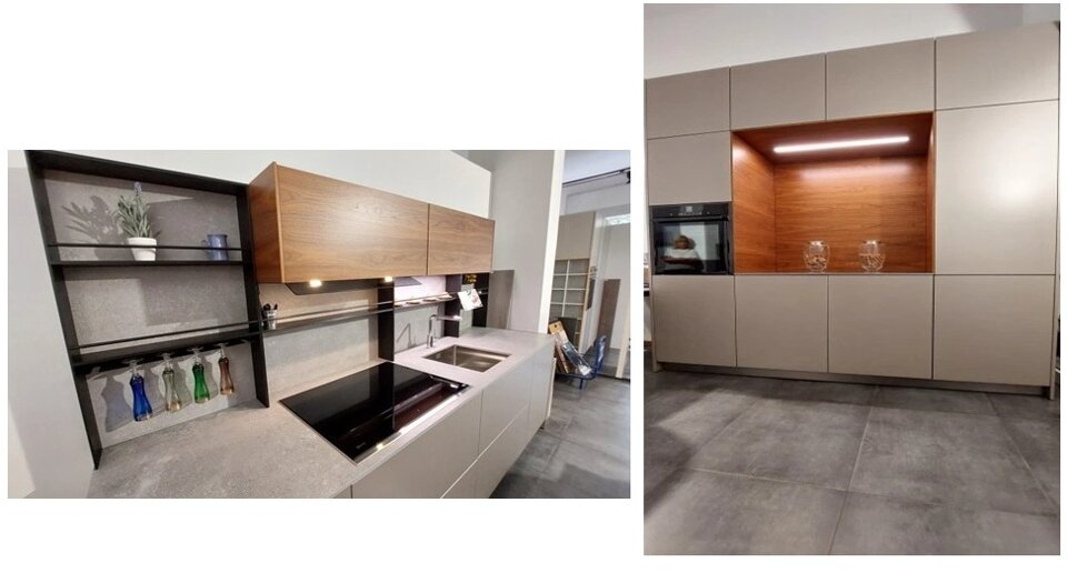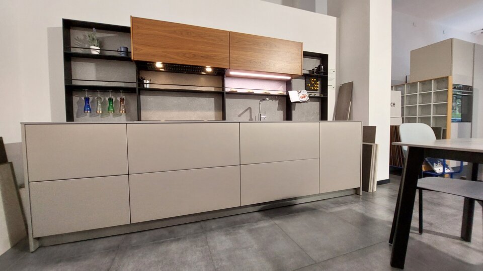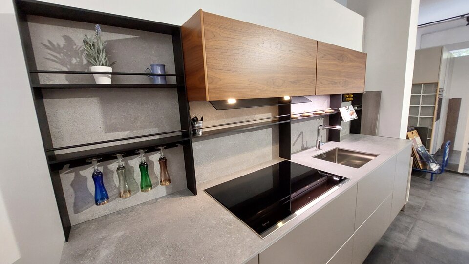 Cucina tedesca di alta qualità Allmilmö PICCO finitura laccato opaco anti impronta Diamant Lack FLANEL INOX con parti in legno di noce.