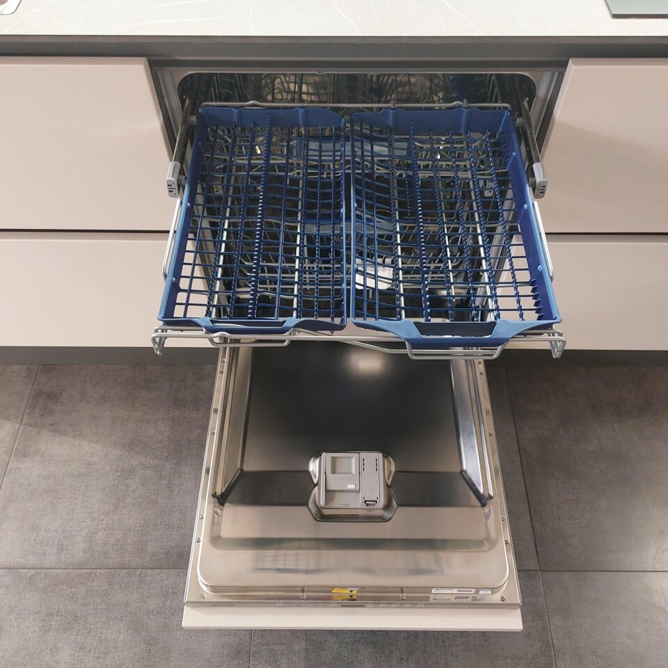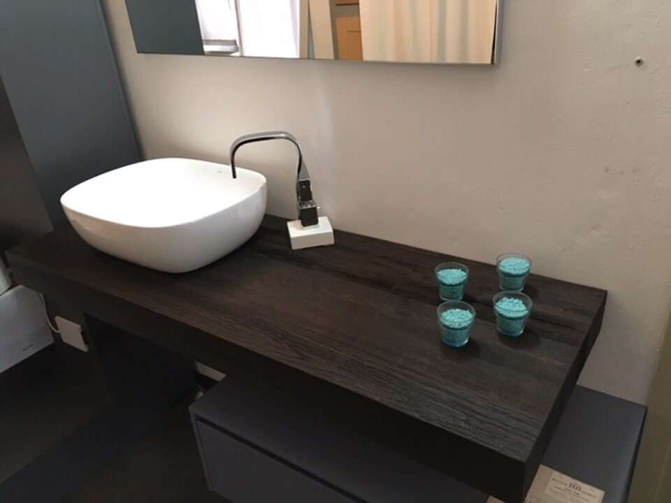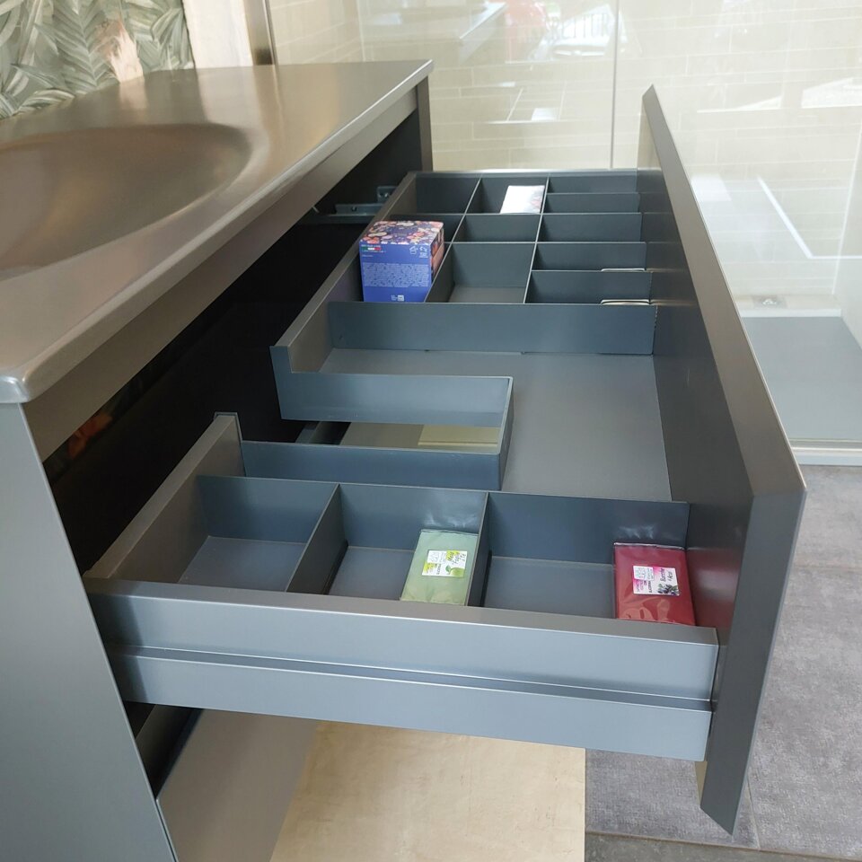 Il cassetto superiore è personalizzato con l'attrezzatura con i separatori. Il lavabo è provvisto di piletta click-clack con copripiletta in ceramica color GRIGIO FERRO e sifone salvaspazio.
