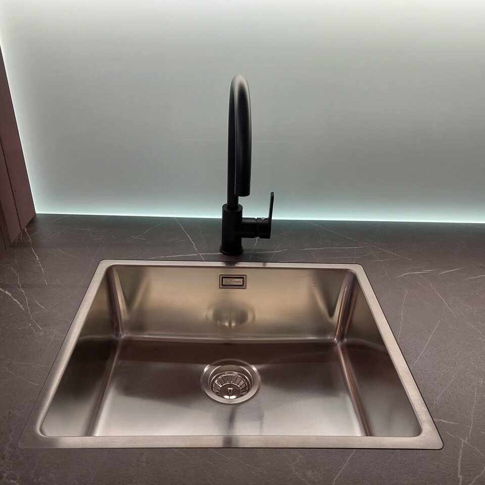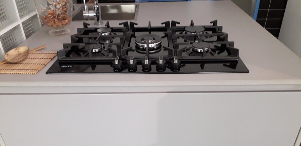 Piano cottura a gas in acciaio nero NEFF largh.cm.75 con wok da 4 KW con nuova tecnologia FLAME SELECT per impostare con precisione la potenza della fiamma su 9 livelli - Lavello semifilo inox 1 vasca BLANCO - Miscelatore cromato BLANCO.