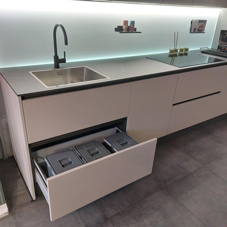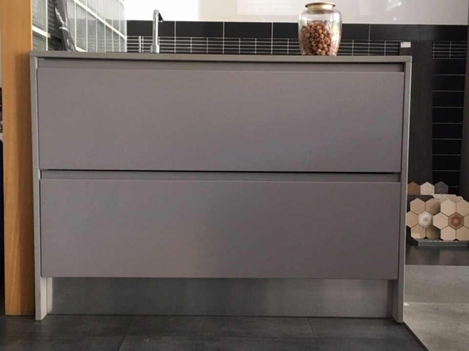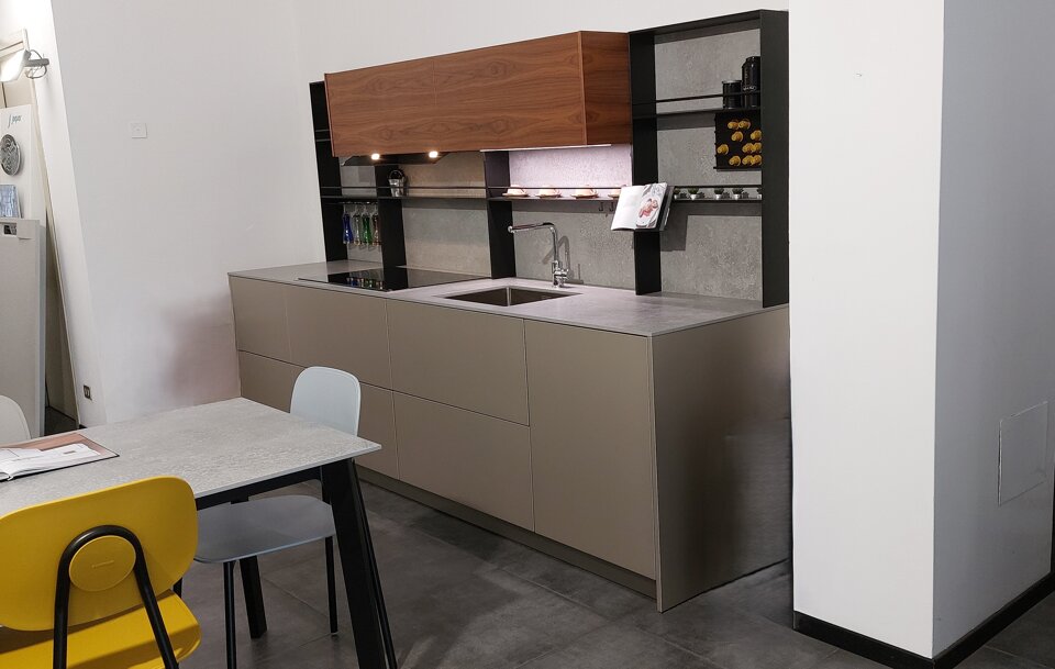 La laccatura opaca colore TORTORA si armonizza con le gole, lo zoccolo grafite e con il top in HPL stratificato Grafite Brown.
