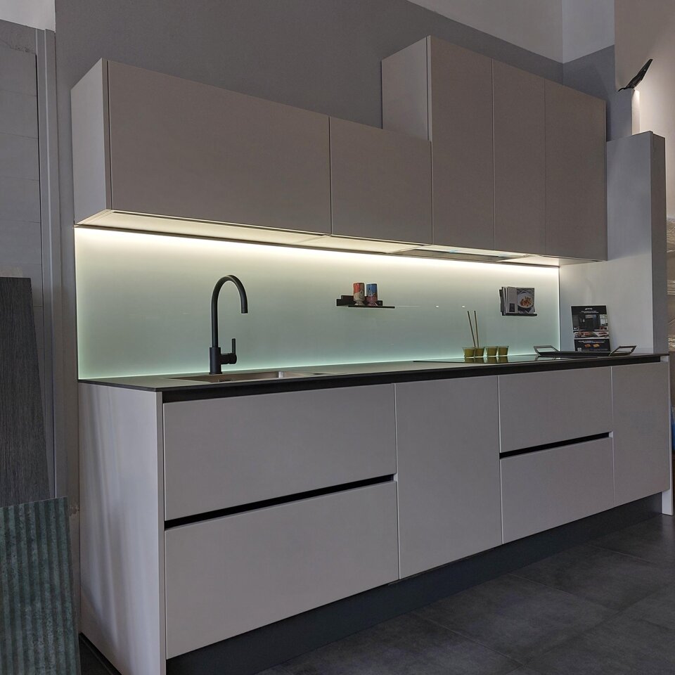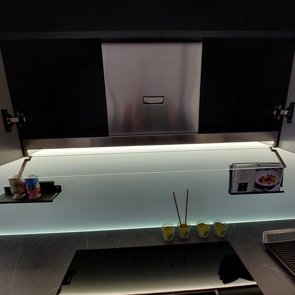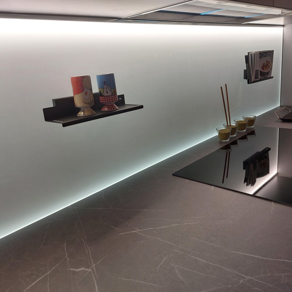 Il particolare schienale tra basi e pensili è in vetro retroverniciato bianco con illuminazione led dimmerabile, magnetico su cui si possono fissare e spostare liberamente gli accessori.
