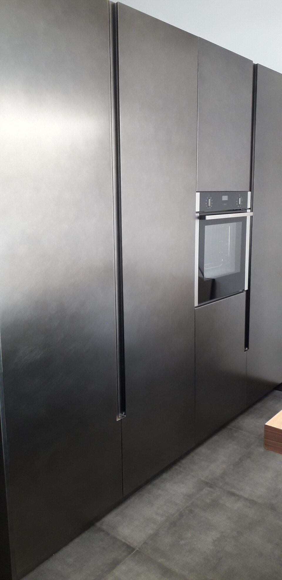 Antares AS10 LINE + SISTEMA è una cucina dal design moderno, ricca di dettagli ricercati come la presa delle maniglie integrate nelle ante delle colonne in finitura laccato metallo liquido STEEL TITANIO. Le basi con i frontali laccato opaco Grigio Quarzo presentano l'apertura con gola laccata nello stesso colore dei frontali. La cucina è dotata di elettrodomestici di qualità superiore.