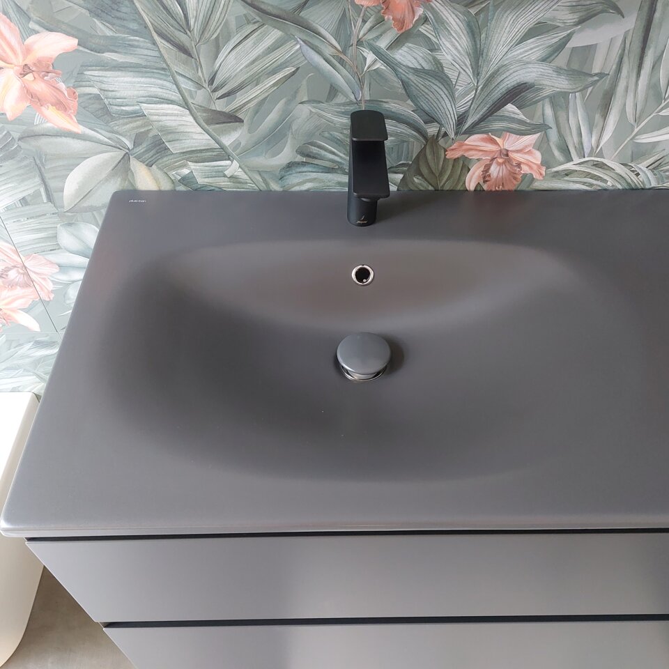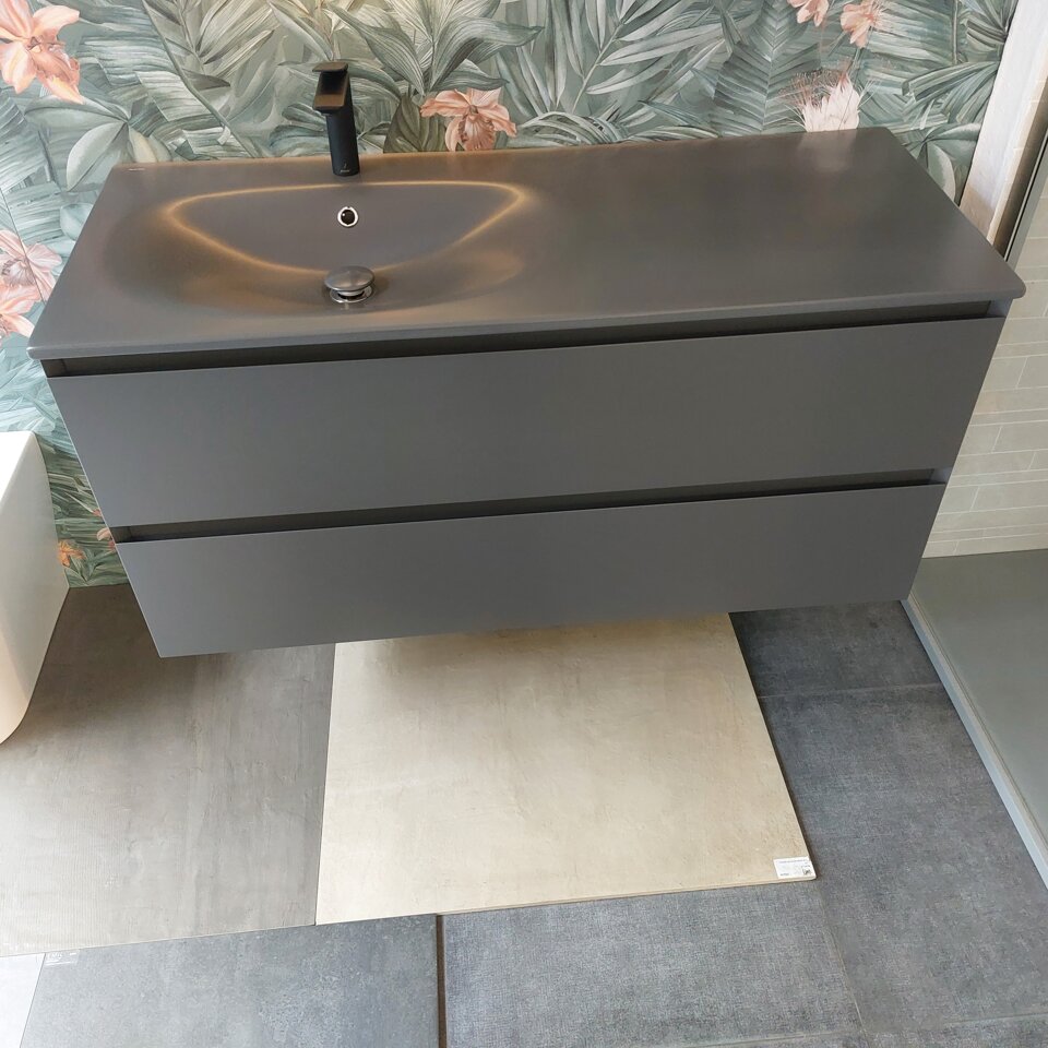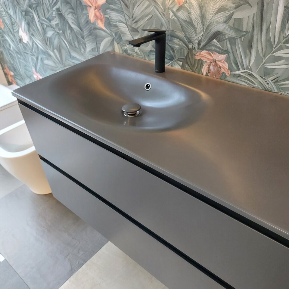 Il top con lavabo integrato decentrato è in ceramica PLUS+TON colore GRIGIO FERRO come la laccatura del mobile, per creare un effetto monolitico.